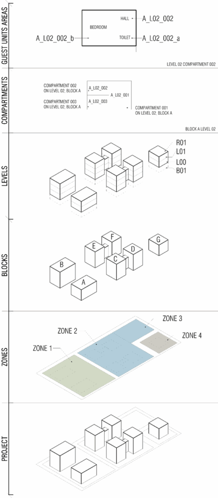 In Touristic Projects such as Hotels, Guest Units are characterized by the Key Number. In these cases, the key number corresponds to the Compartment code. Inside Guest Units, there are areas or subdivisions that should be characterized by lowercase letters.Rooms Parameters